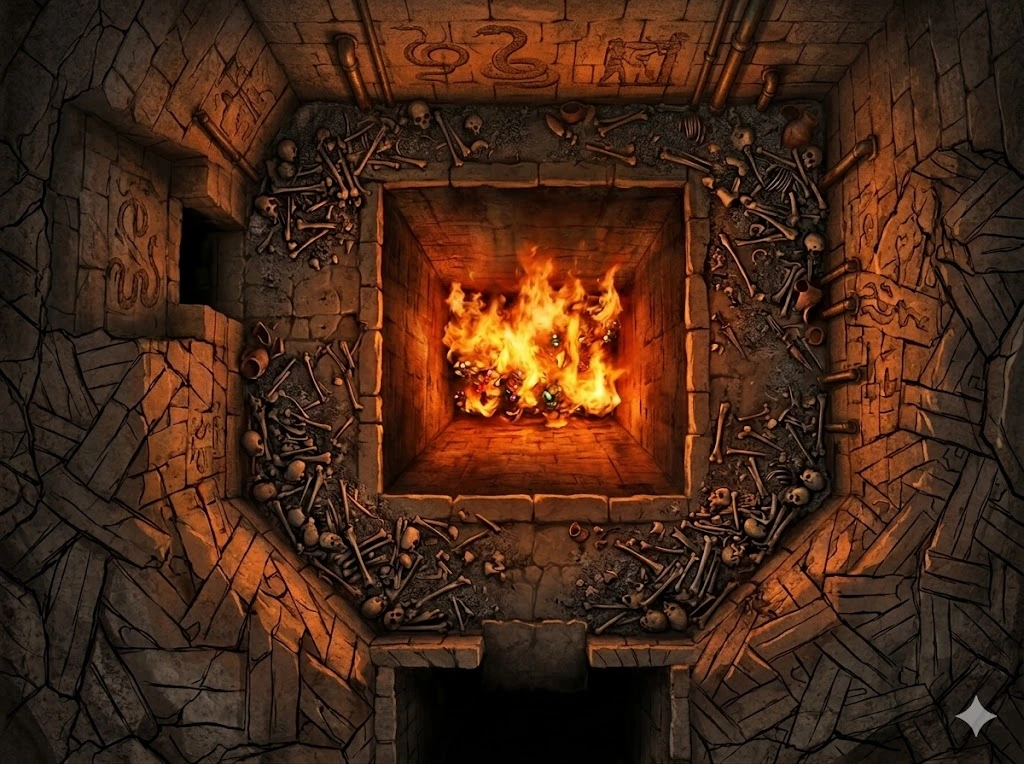Com a armadilha preparada, restava só esperar. Demorou um pouco, mas, eventualmente, um grupo de cinco goblins (sendo um deles um ancião) entrou na sala. Só que eles nos viram. Tentamos argumentar que não fomos nós que matamos o goblin, e o ancião avançou até próximo da armadilha para conseguir ver o corpo mais de perto. Nisso, o Wolras o empurrou no fosso de sacrifício e o mundo veio abaixo.